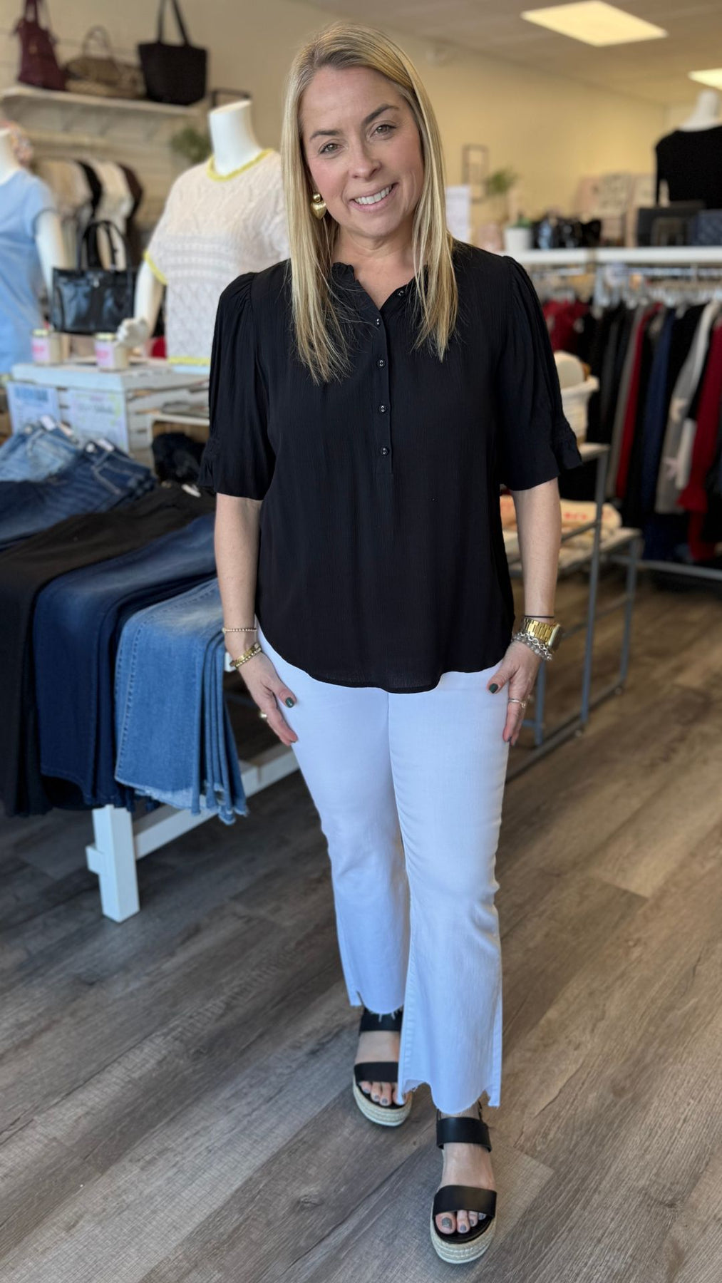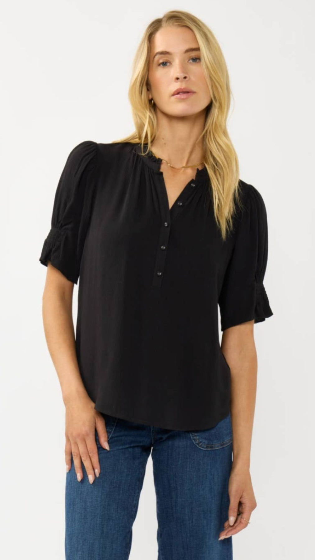 Short Puff Sleeve Crinkled Button Top