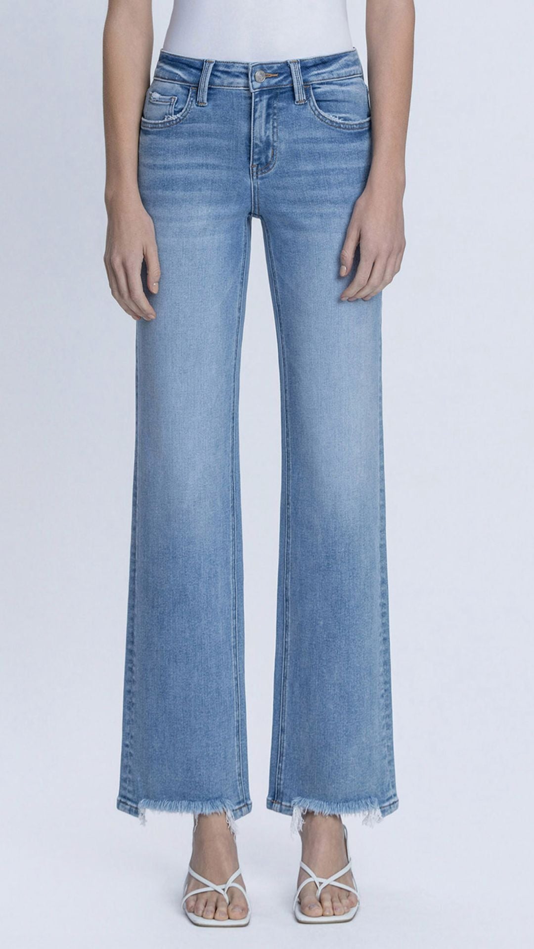 Mid Rise Medium Wash Full Length Distressed Hem Slim Wide Leg Jeans