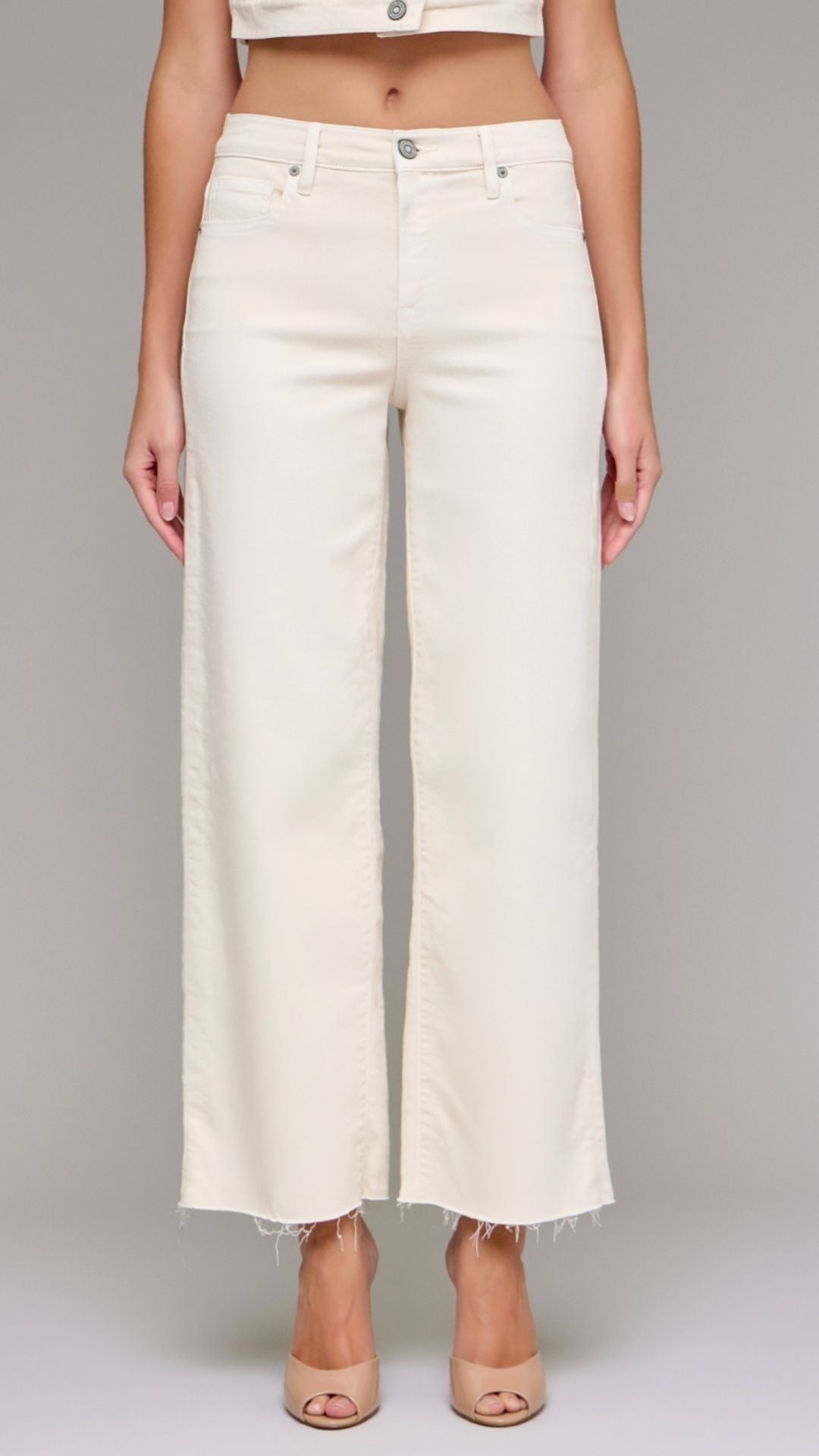 High Rise Light Wash Seamless Waistband Raw Hem Wide Leg Jeans
