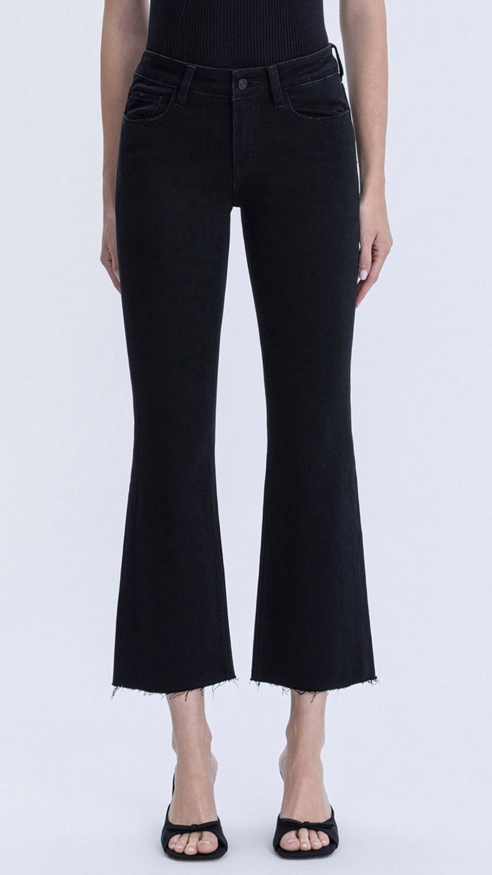 Mid Rise Jet Black Raw Hem Bootcut Jeans