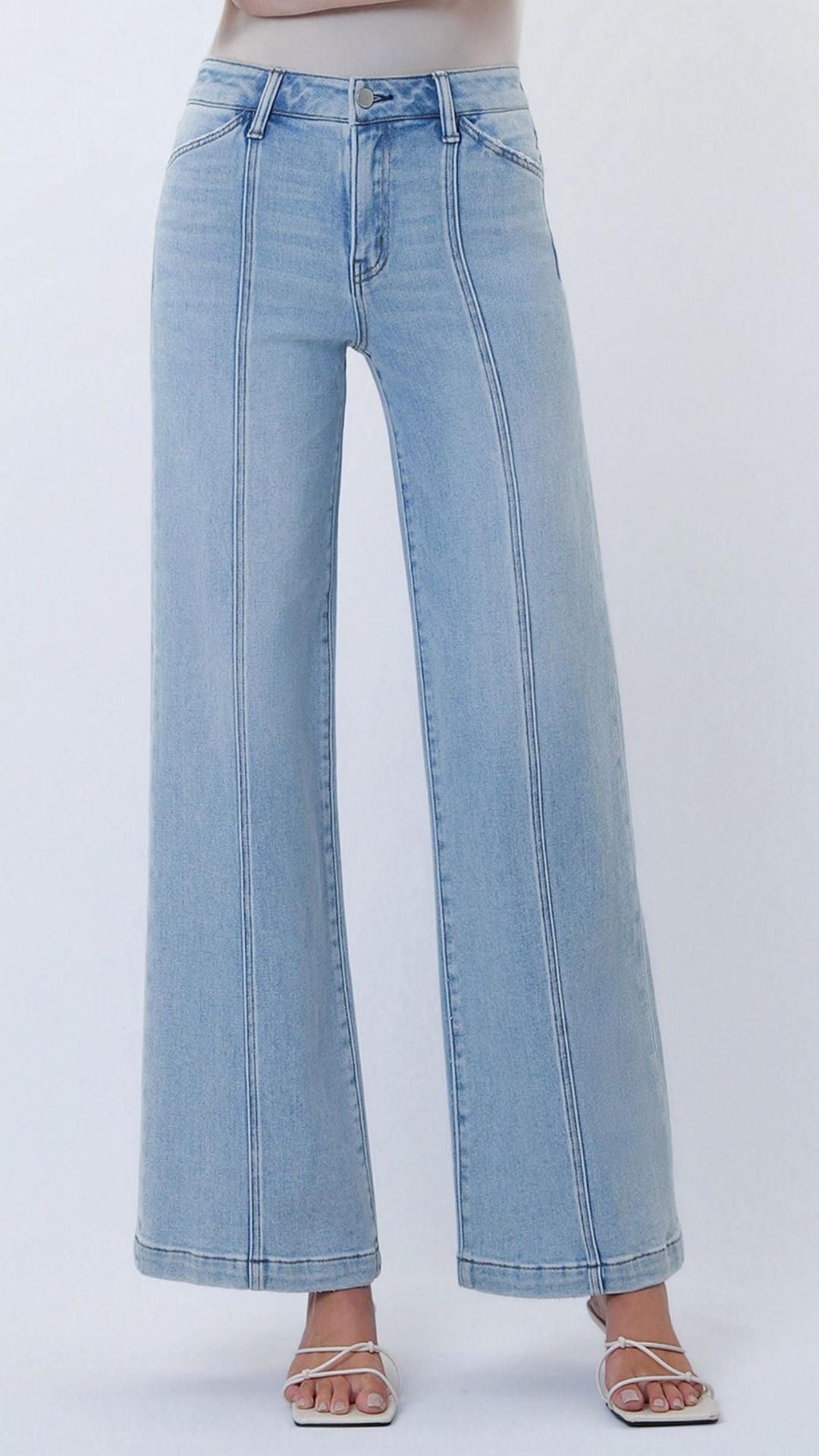 High Rise Light Wash Full Length Cut Seam Detail Wide Jeans