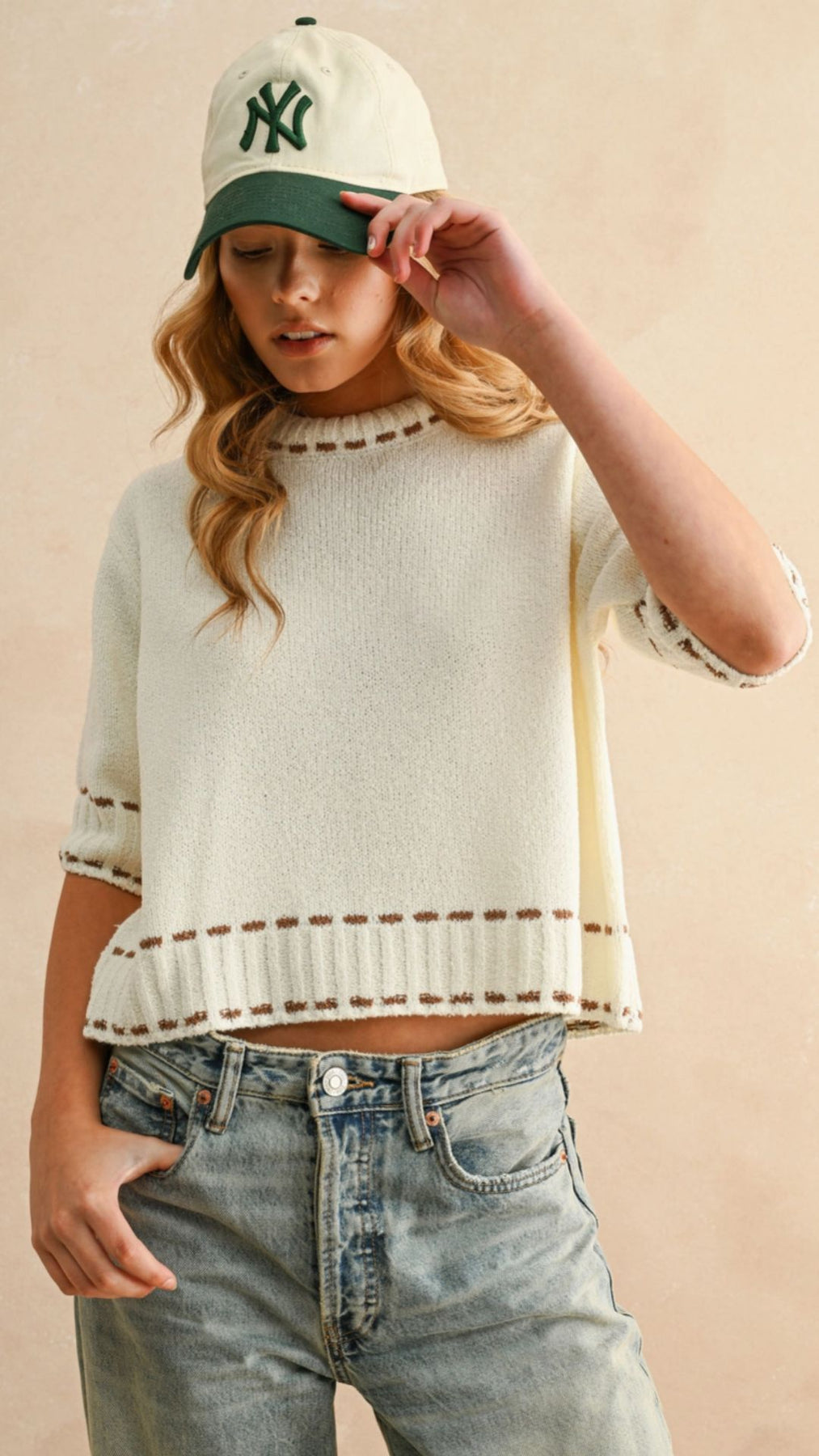 Brown Stitch Detail Short Sleeve Sweater