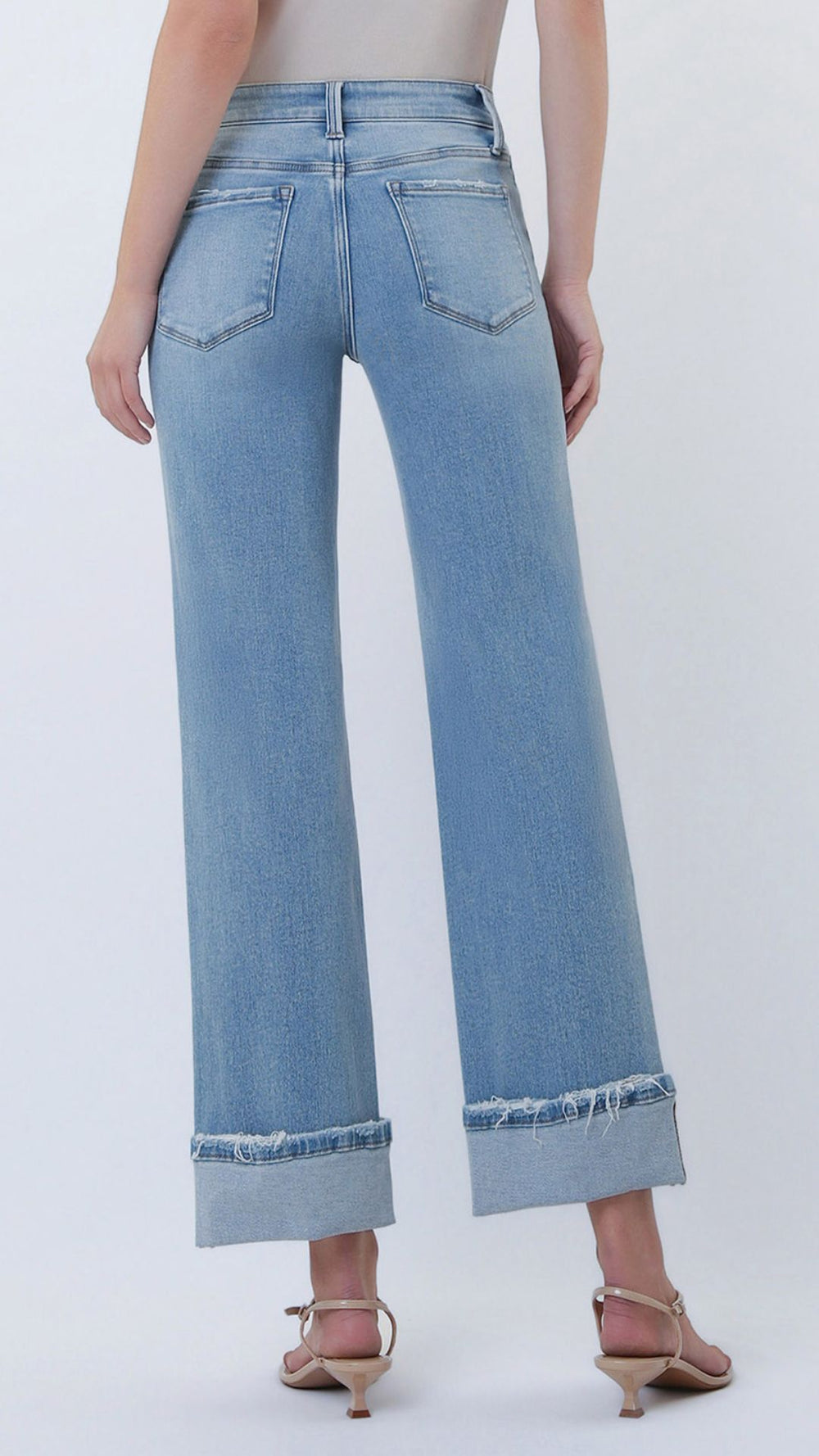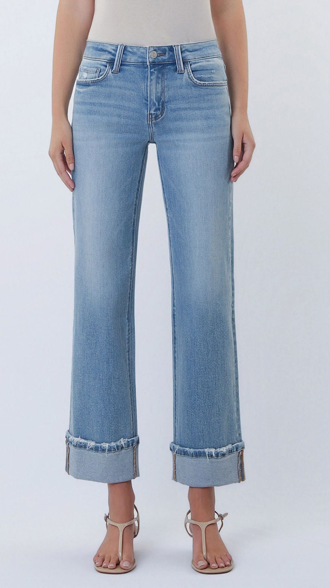 Mid Rise Medium Light Cuffed Slim Wide Leg Jeans